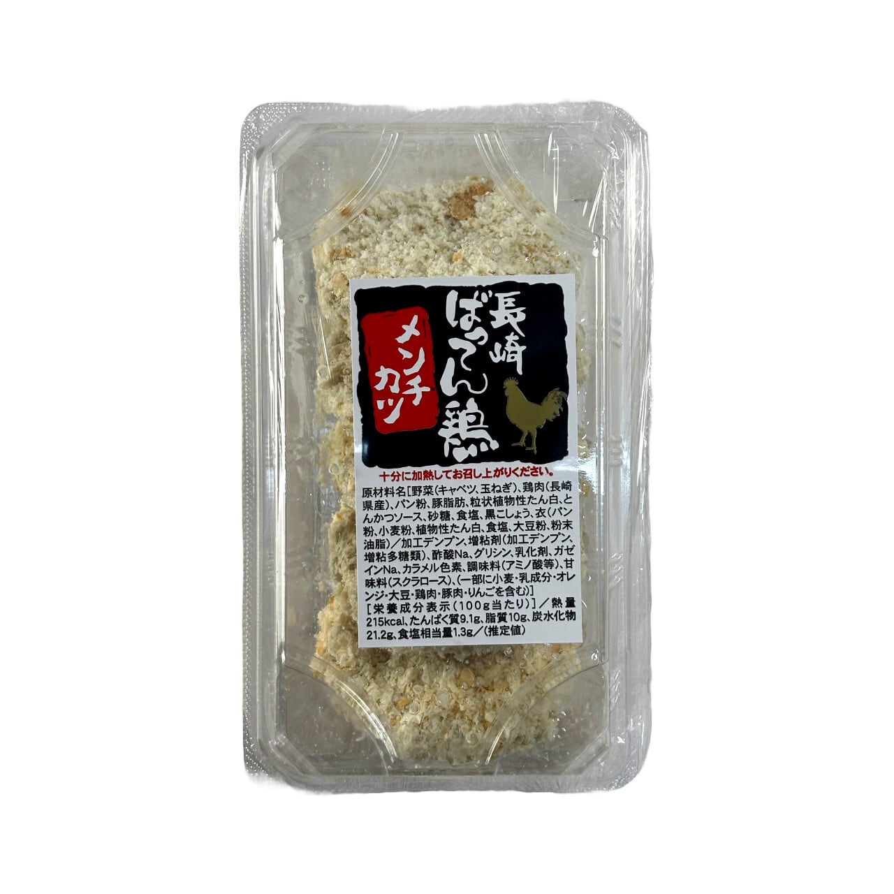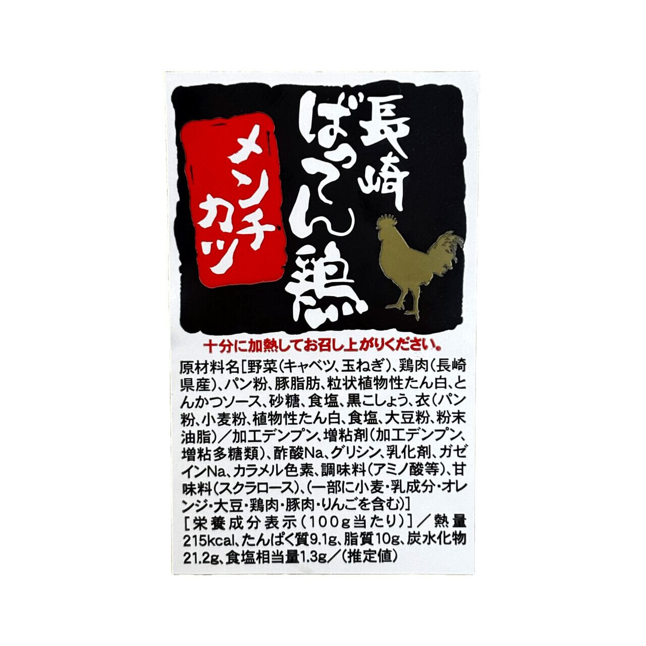 原材料名:野菜(キャベツ、玉ねぎ)、鶏肉(長崎県産)、パン粉、豚脂肪、粒状植物性たん白、とんかつソース、砂糖、食塩、黒こしょう、衣(パン粉、小麦粉、植物性たん白、食塩、大豆粉、粉末油脂)/加工デンプン、増粘剤(加工デンプン、増粘多糖類)、酢酸Na、グリシン、乳化剤、カゼインNa、カラメル色素、調味料(アミノ酸等)、甘味料(スクラロース)、(一部に小麦・乳成分・オレンジ・大豆・鶏肉・豚肉・リンゴを含む)